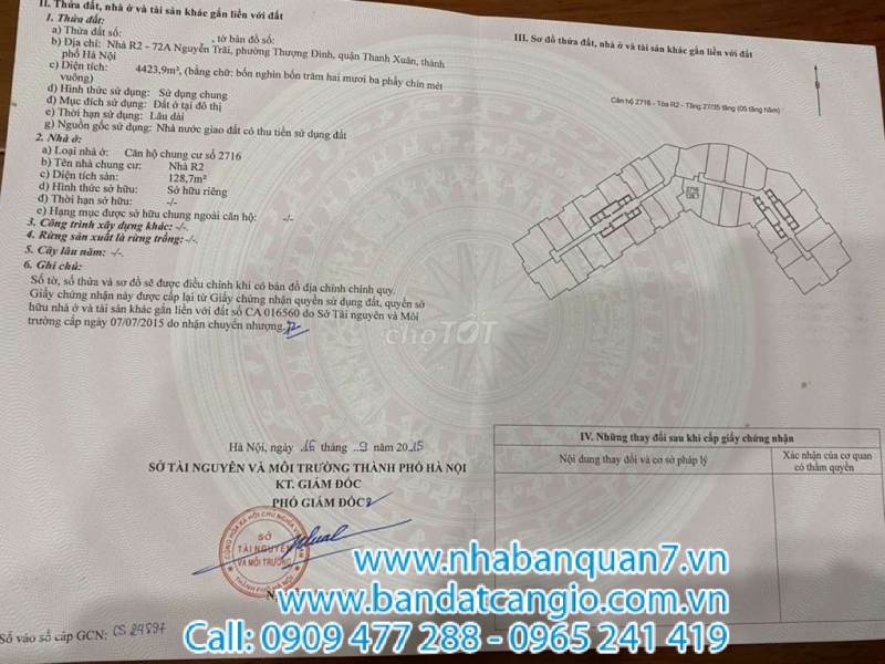 Căn số 2716 tầng 27 sảnh B toà R2 diện tích 129m2 – sổ hồng chính chủ – Số 73 Nguyễn Trãi – Thanh Xuân – Hà Nội